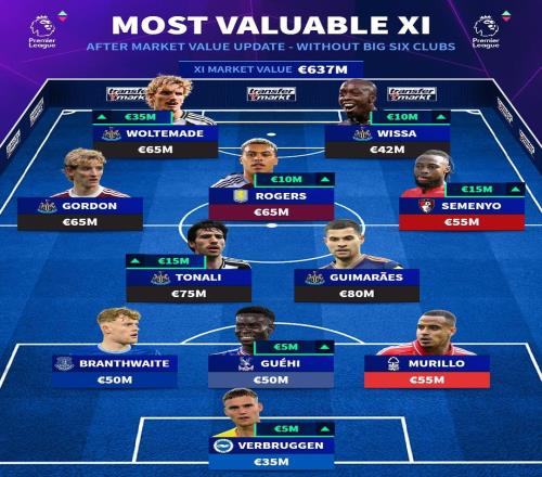 在更新了英超球员身价后,德国转会市场网站列出了英超非BIG6最贵阵容,沃尔特马德领衔纽卡5人入选。德转列英超...