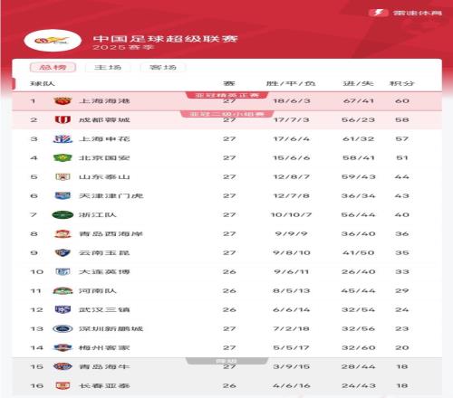 中超最新积分榜